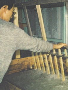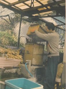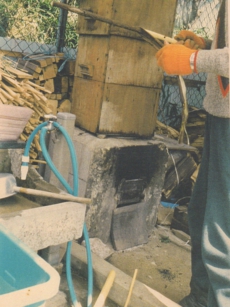 ![]() 【 2 原木蒸し】 樹皮を剥ぎやすくするために蒸します。 |