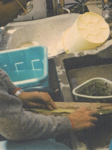 ![]() 【 9 紙漉き 】 紙料(叩解したもの)を汲み込み、簀全体に行き渡るようにします。 |