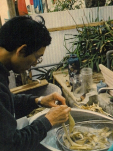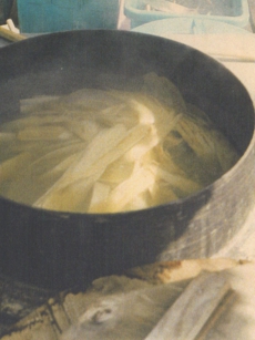 ![]() 【 5 煮熟 】 煮えたぎる湯に、アク(灰)を入れ白皮をほぐしながら入れます。 |