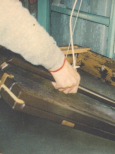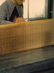 ![]() 【 7 叩解 】 叩き棒で丁寧に叩き、束になっている繊維をばらばらにします。 |