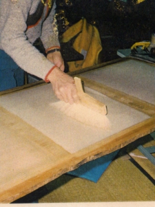 ![]() 【 10 紙床付け 】 漉きあげた紙は簀から外し、紙床板に重ねます。 |